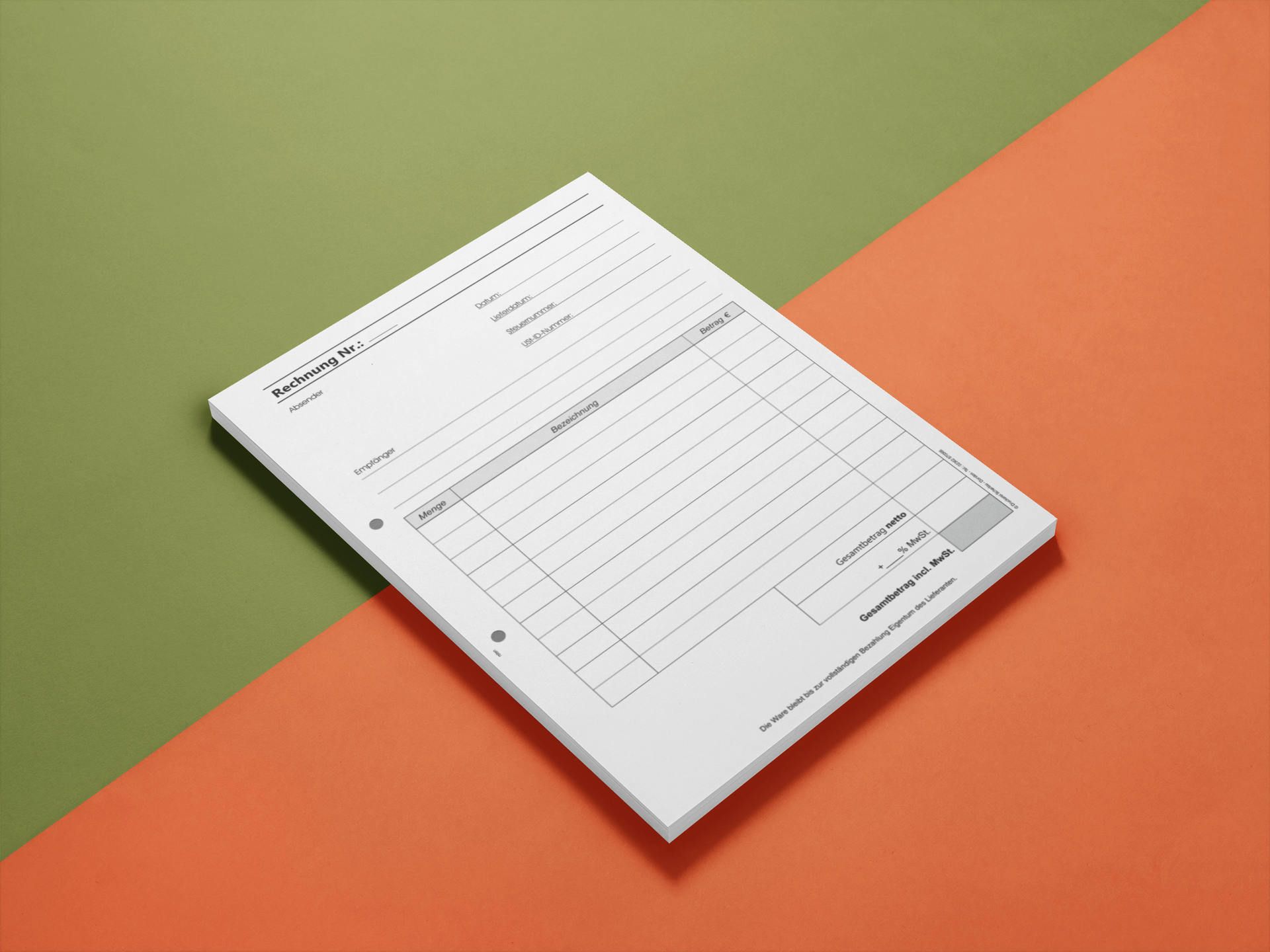 Rechnung (A4, 2x40 Blatt, selbstdurchschreibend mit farbigem Durchschlag, mit Netto- und Bruttobetrag, MwSt. uvm., zur Erfassung aller rechtlich erforderlichen Angaben) weiß/grün